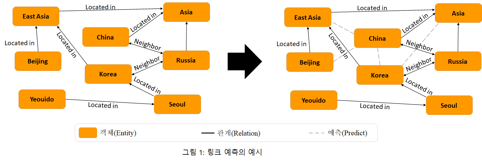 우리는 link prediction 모델을 학습하기 위해 지식 그래프를 triplet dataset(삼중데이터 집합)을 바꾼다(설명의 편이를 위해 [그림 1]의 지식 그래플 조금 축소하였다).